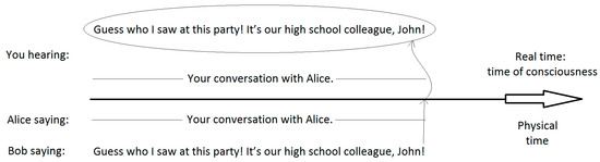 In Figure 2 we can see on the lower part the events as they happen in the physical time, and on the upper part the events as they happen in the time of consciousness. We can see that the entire utterance of Bob takes place all at once in consciousness at the moment of physical time when Bob utters your name. So, we have an extended temporal unity in consciousness that takes place in an instant of physical time. The reason why it happens in an instant of physical time is that if it were to somehow be recorded somewhere and at the moment of uttering your name, it would have been played back to you, then in the time in which you would be hearing the playback of Bob’s utterance, you would become deaf to what Alice would continue to say to you. But there is no point in which your conversation with Alice is interrupted. Your conversation with Alice is continuous at all times. So, the entire Bob’s utterance can only take place at an instant of physical time.