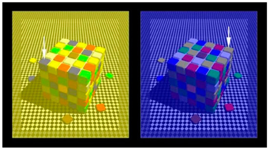 Another example, from the visual domain, is shown in Figure 6. The level of the full visual scene impresses a top-down influence upon the level of colors and makes the squares highlighted by the arrows to become blue and yellow, when in isolation they are gray. As in the case of speech, the influence is done such that the overall highest level is meaningful in a certain way. In this case the meaning is that there are yellow and blue filters added on top of the original images of the cubes, so if the filters would be subtracted then the indicated squares would truly be blue and yellow, so they are made to be seen blue and yellow also with the filters applied.