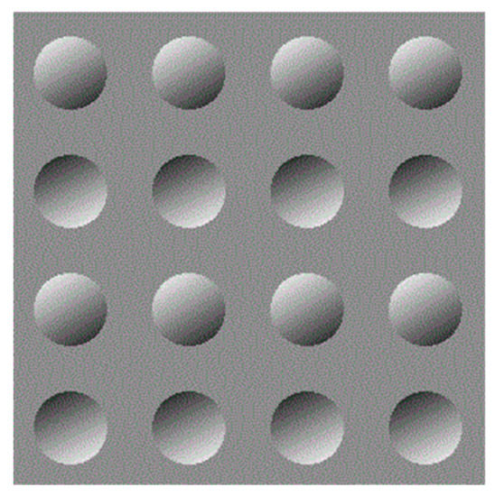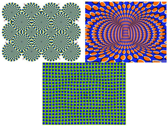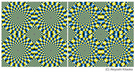 The best example of top-down influence that the level of time receives from the levels above it are the so-called “motion illusions”. This is of course a misnomer that starts from the false assumption that there is actually a “physical world” out there in which there is no motion, and since we see motion in these images, that motion is an illusion. But since there is no physical world1, then they are not illusions. There is actually motion in them, because motion is nothing else but a quale in consciousness, is the way the level of time manifests its quality when it is inherited in the visual domain. Let’s take some examples and take a careful look at what is happening in them. For simplicity of expression I will still call them “motion illusions”. Let’s look at Figure 7.