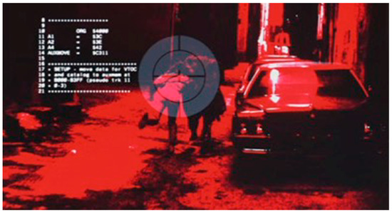 In The Address of the Eye, Sobchack [1] uses Ihde’s embodiment relationship to consider the first-person camera movement of Lady in the Lake. She argues that Montgomery’s film is fundamentally flawed for failing to translate natural fluent movement. However, what she does not do (and what this essay contributes) is show how such failure to produce natural movement can play a significant part in experiencing the narrative of the film from a postphenomenological vantage. For some filmmakers, POV is embraced. James Cameron, for example, has frequently deployed subjectivity throughout his films, particularly through the robotic sight of the cyborg in The Terminator (1984) [20] (Figure 1).