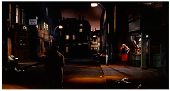 As noted, Lewis’ concealed camera is shown hidden within his duffel coat at waist level, yet when we adopt the proceeding camera gaze upon the prostitute (signified by the crosshair), she stares straight into the camera lens at eye level. If the arrangement of this shot is for the viewer to adopt the gaze of the camera exclusively, rather than the cameraman, then the mise-en-scène should be at an upward 45-degree angle from Lewis’ waist. Instead, the camera eye (confirmed by the crosshair) is in line with the woman’s corresponding eye (Figure 5), yet she does not acknowledge the camera, which, as far as the spectator is concerned, remains hidden within the coat. As Edward Branigan [27] (p. 157) notes, “in a POV shot the specific angle of view is importantly tied to the attention and awareness of a specific character and thus the angle must be captured and held in working memory by the spectator”. Therefore, the question is raised as to whose perspective the viewer is adopting—camera or Lewis?