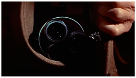 The camera used to produce these subjective sequences within the film was a 35 mm Arriflex [45] (p. 17), which revolutionised the filmmaking practice in significant ways [45]. This was fundamentally owed to its unique prism reflex viewfinder that enabled the photographer to see exactly what was being shot. Film cameras before this had viewfinders either to the side or above the taking lens. As a result, the viewfinder could not produce a perspective exactly the same as the lens. This was what was known as the parallax error, which meant displacement of the apparent position of an object in the optical centre of the viewfinder and that of the taking lens. This was usually overcome, as Leo Enticknap [46] (p. 38) states, by “skewing the angle of the viewfinder lens slightly – in order for the former to give a reasonably accurate view of what the latter will record”. However, as he also notes, slight errors could still occur, particularly when filming close subjects, such as hands, which are often included in subjective films. This, in part, contributes to the erroneous look and feel of subjective movement in Lady in the Lake. The Arriflex’s reflex viewfinder solved this issue for Dark Passage with a system of mirrors that “eliminated parallax problems, making it the first 35 mm portable camera to offer a level of functionality like that of a full-scale studio camera” [46].