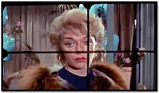As she unzips her skirt, the camera looks away, revealing the silhouetted hand of Lewis across the lens as he releases the spike. The focus swivels back onto the woman whose mood quickly changes to unbridled fear as she recoils from the approaching camera, screaming directly into its crosshair lens.