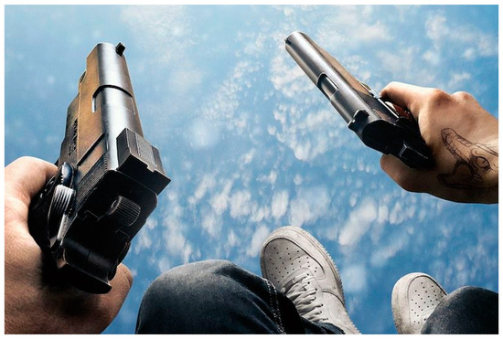 Galloway [5] uses the subjective shot as a template for first-person shooter (FPS) games by localising his discussion of the subjective camera to a corpus of weapon wielding aesthetics within narrative cinema. In addition to Peeping Tom, numerous examples of this can be seen in Alfred Hitchcock’s Spellbound (1945) [6] (Figure 6), Clint Eastwood’s American Sniper (2014) [38] and Ilya Naishuller’s Hardcore Henry (2015) (Figure 7) [39] to name just a few. Within the subjective moments of these films, the viewer is temporarily placed into the body of a character or weapon that is intending to kill. Following Galloway’s observation, this highlights how the use of subjective camerawork in film usually portrays a hallmark of weaponry.