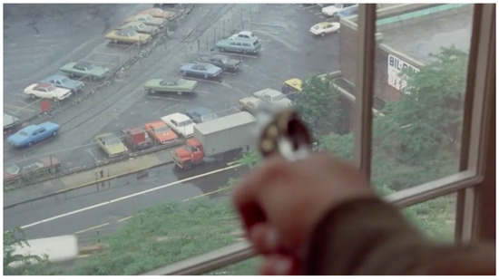 Hap-tech narration, however, is more than simple identification between subjective camerawork and gun similarity. Instead, it can be considered a tool to analyse how the POV aesthetic folds back into the story, reflecting a particular type of character body vessel that a viewer inhabits. In Scorsese’s Taxi Driver, for example, a standout moment of explicit hap-tech narration is reserved for a shot in which Travis Bickle (Robert De Niro) takes up a gun from an arms dealer and aims it out of a window. Although the majority of this film is portrayed from the perspective of Bickle as he adjusts to civilian life after the Vietnam War, it is this explicit moment of gun handling that feels the most distinctive in its subjectivity. As Bickle takes up the weapon and nears the window, the mise-en-scène jumps into the gaze of what feels to be a smaller, lighter camera, perhaps operated by the actor. This lighter camera traces the movement of the outstretched gun, as Bickle’s first-person gaze pans the street in a downward trajectory from behind the weapon searching for a target (Figure 8 and Figure 9). This is a crucial moment within the film because it indicates the change in course that the narrative takes, where homicide becomes the only option left for the solipsistic character.