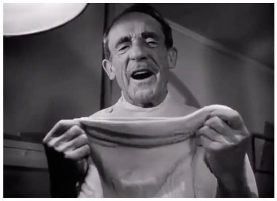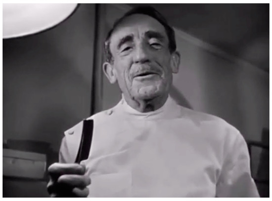 In accordance with Sheets-Johnstone’s [44] work, which argues how personhood is predicated on movement, we can see how Parry’s impaired technological camera/body movement constitutes his impaired fictional character traits. Within the film’s diegesis, Parry is a convict, a condemned man on the run, escaping a life sentence following the crime of uxoricide. But he is also additionally revealed as a victim body too. This shift from corruption to victim is disclosed after Parry’s escape when he is helped by a woman, Irene Jansen (Lauren Bacall), who divulges to Parry/the viewer how she knows he was framed. With her help and belief in his innocence, Parry is portrayed in a new fictional light as a casualty of justice. This victim body culminates in a later sequence in which Parry undergoes facial reconstructive surgery with black-market practitioner, Dr. Walter Coley (Houseley Stevenson). This sequence is particularly disconcerting and emphasises Parry’s new established role as vulnerable victim. As Coley administers us/Parry with an anaesthetic, he begins to callously toy with us about botched facelifts and innuendo as to why he was dismissed from professional practice (Figure 13 and Figure 14).
