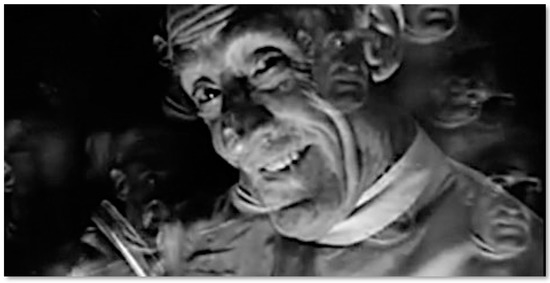 The drug in Parry leaves him/the viewer physically weak and in a state of vulnerability, denoted by a blackout as Coley places a flannel over Parry’s eyes, blinding the viewer’s sight as the doctor readies himself to shave us in preparation for the surgery. This darkness cues a paranoid psychedelic dream from Parry (Figure 15) in which Coley’s laughing face repeatedly chants, “ever seen a botched plastic job?”