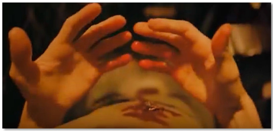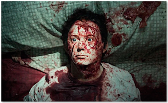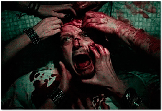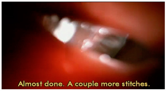 The effect is achieved by way of a pink latex oval shaped eyehole that covers the camera lens, which the surgeon proceeds to sew up. Watching this experience through a sloped pinkish oval as the needle pushes through flesh, suturing the eye shut is as lengthy as it is disturbing, with each stitch painfully felt by the viewer.