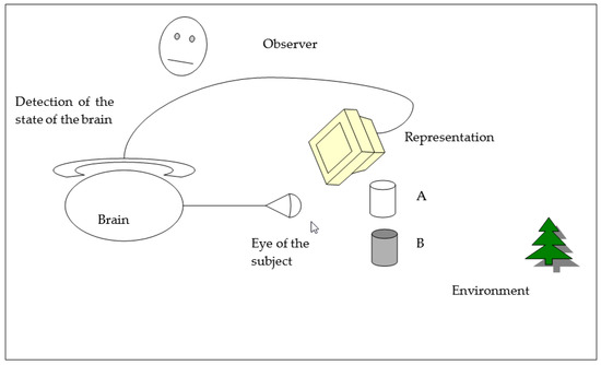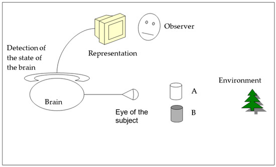 We turn the screen representing the inner “physical” state of the human brain around so that the eye of the human being, the brain—which is being detected and observed—is able to watch it (Figure 2). Again, the whole system, as a hypothesis, is considered to be determined.