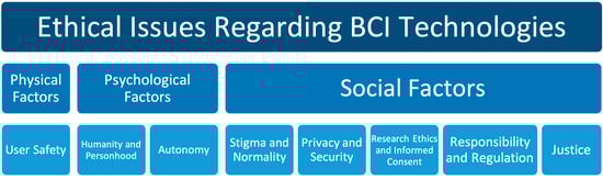 Brain–Computer Interface (BCI) technology has been a promising area of research in recent decades, with advancements in the technology leading to a broadening of applications []. Researchers and clinicians are increasingly able to accurately interpret brain activity through both invasive (implanted) and non-invasive (outside the body) monitoring devices, allowing them to create better therapeutic solutions for patients suffering from disorders or diseases that inhibit their ability to interact with the world around them, e.g., patients suffering from the paralyzing locked-in syndrome who, with the use of a BCI device, are able to regain the ability to communicate. BCI technology is also being used for non-medical applications, such as gaming and human–technology interfaces. With this technology comes a number of ethical concerns that require consideration by all stakeholders involved (researchers, clinicians, patients and their families, etc.). Previous research into the ethics of BCI conducted by Burwell et al. [] analyzed past publications that addressed ethical concerns associated with BCI technology. Burwell et al. identified common themes in the literature, including issues of responsibility for the consequences of BCI use; potential loss of autonomy, identity, and personhood as a result of BCI use; and security issues regarding the collection, analysis, and possible transmission of neural signals [].