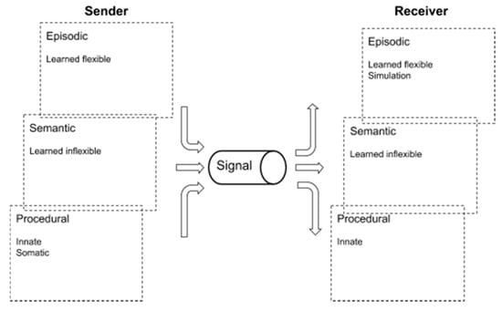 In order to ground communication in memory, we link reflexive communication to embodied and innate aspects of an animal, as well as to reflexive behaviors. Indeed, this is plausible given that Type 1 processes rely on procedural and semantic long-term memory, thought to be instantiated in many animals. Importantly, as previously pointed out, such aspects can take very different forms depending on species. Moreover, reflexive signaling can involve conscious aspects, but are nonetheless seen to principally make up non-conscious functions. Reflective communication is linked to mentalizing abilities and Type 2 processes that rely on episodic memory and working memory. These competences are also widely spread although it is unclear to what extent they are found to a high degree.