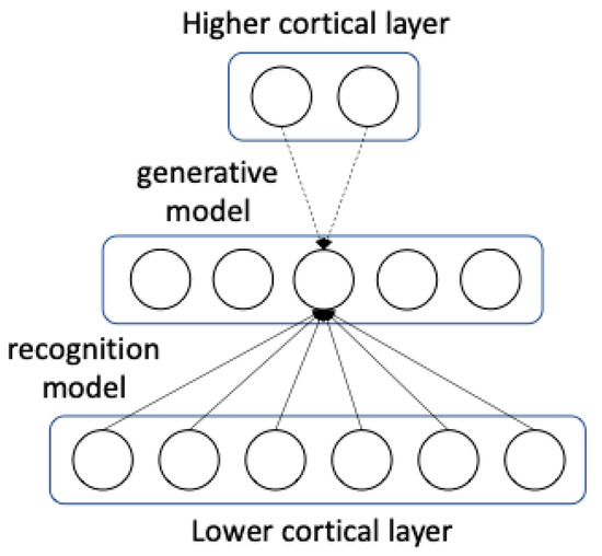 Every neuron—here only illustrated by the one central neuron—is bidirectionally connected to some or all the neurons in the higher and lower cortical layer. The generative and recognition models are indicated for a single neuron.