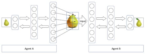 Two communicating (Agents A,B) are modelled using two independent neural networks, each of which was trained on different but similar data (here: images of pears). By simple forward computation from higher to lower cortical level, (Agent A) generates an image of a pear that is fed into the input layer of (Agent B). (Agent B) can then recognize the pear, resulting in an effective communication amongst the agents.