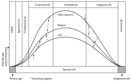 Figure 1), which shows across the six stages the developmental path of the ‘everyday ego’ along three trajectories, first rising then falling, showing the split or dissonance between the ego and the constantly, if subliminally, present ‘spiritual self’.
