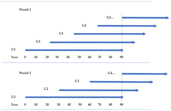 Based on these assumptions, the populations in the two worlds will soon differ, even though each person gives birth to the same number of children. In World 1, the population will stabilize around four simultaneously living generations, while in World 2 the population will stabilize around three simultaneously living generations. Although each generation will contain the same number of individuals in both worlds, the worlds’ total populations will thus differ. (Note that the difference would, of course, be even bigger if the difference between parents’ timing of procreation were bigger.) This can be illustrated as in Figure 1. (Note that the first generation, G1, dies at the same time as the fifth generation, G5, is born in World 1, while G1 dies at the same time as G4 is born in World 2.)