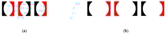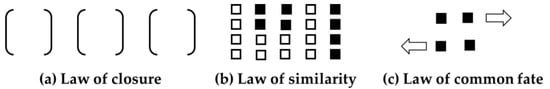 Figure 10 shows the competitive relationship between the laws of closure and proximity. When the law of closure is stronger than the law of similarity, the parts that make up the closed shape are recognized as a group (Figure 10a). However, when the law of similarity is stronger than the law of closure, parts with the same color are grouped (Figure 10b). Even though there are individual differences in the specific distances and the positional relationship of the parts related to the victory or defeat of the two factors, this phenomenon is observed in many individuals. Furthermore, the competition between these multiple factors causes visual illusions such as My Wife and My Mother-In-Law [27] or Rubin’s goblet-profile [28].