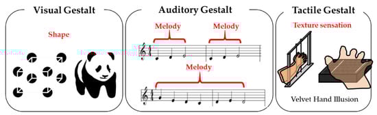 Gestalt grouping helps humans recognize the information of separate parts as a unit [6]. Moreover, illusion phenomena related to Gestalt grouping have also been discovered. When perceiving an object through visual, auditory and tactile senses, humans recognize a set of information as a unit called a Gestalt. These Gestalts enable us to recognize facial expressions and enjoy listening to music. Depending on the law of the Gestalt, interesting illusion phenomena with respect to the visual and auditory senses have been reported, such as the visual Müller–Lyer illusion [11] and auditory octave illusion [12,13].