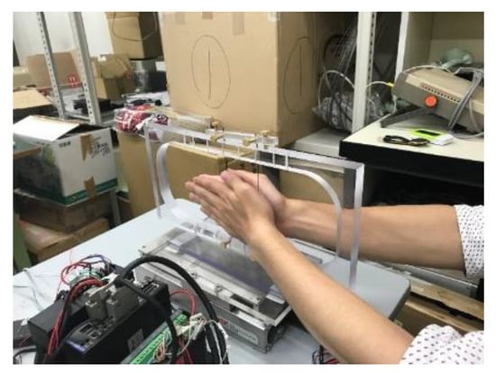 The tactile display was developed with a dot-matrix display in which 768 tactile pins were moved up and down by a bimorph piezoelectric ceramic actuator. This system consisted of two refreshable Braille displays (SC10, KGS, Saitama, Japan) [25] with a presentation area of 85 mm × 70 mm, which was appropriate for palm presentation, along with a DIO board (PC–2772, Interface Co., Hiroshima, Japan), PC (OS: Windows 10, 64 bit) and Visual C++, as shown in Figure 5a. The pins were arranged at 2.4 mm intervals, which were narrower than the two-point threshold of the palm of the hand (13 mm) [19,26]. Therefore, the participants could recognize the pins in a row as a line, and this display could provide the VHI stimulus, i.e., two reciprocating parallel lines, as shown in Figure 5b,c.