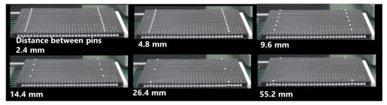 The purpose of this experiment was to clarify whether there is an important relationship between the VHI and tactile Gestalt. Since the VHI is not induced without movement or when the stimulus condition is a single line, it was assumed that the laws of closure and common fate were the essential factors for VHI induction. Thus, the effects of these factors on the intensity of the VHI were investigated. The basic stimulus conditions were as follows. The line length was 55.2 mm; the distance between the two parallel lines was 60 mm; the stroke was 14.4 mm; and the average speed of the line movement was 80 mm/s. Six types of line conditions were prepared, as shown in Figure 6, in which the interval between the pins was set to 55.2, 26.4, 14.4, 9.6, 4.8 and 2.4 mm. If the law of closure was an essential factor of VHI induction, the VHI would disappear when the participants could no longer recognize the line formed with pins. This experimental trial consisted of six stimulus conditions, and each participant performed this trial four times. In each trial, six types of stimuli were provided to the participants randomly, and they were asked to respond with a “yes” or “no” to questions confirming the VHI appearance.