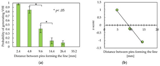 Relationship between pin distances when forming line and probability of generating VHI: (a) probability of generating VHI and (b) z-score.