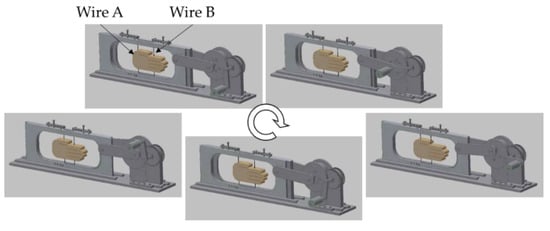 To verify the formulation, a psychophysical experiment was conducted, and the experimental value was compared to the value calculated using the formulation. An experimental setup was developed that could provide the participants with two reciprocating parallel wire movements with different phases. This device consisted of an acrylic frame. Each wire moved back and forth because the rotational motion caused by the experimenter turning a lever was converted to translational motion by the crank mechanism. The velocities of the wires are described by Equations (2) and (3). The distance between the wires, , was 70 mm when the phase difference was 0°, and the amplitude, , of each wire was 60 mm. Therefore, the distance between the wires varied from 10 to 130 mm. The rotational speed, ω, was constant at 4.33 rad/s.