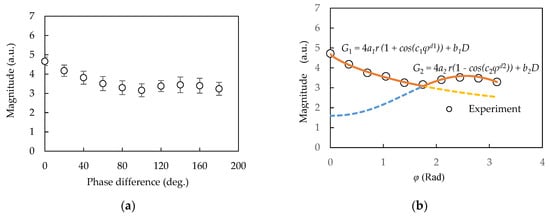 Figure 9a shows the relationship between the VHI magnitude and phase difference, obtained from the experimental results. The maximum VHI intensity was found at 0°, with the VHI intensity gradually decreasing when moving toward a phase difference of 100°. However, after 100°, the VHI intensity gradually increased and a small local maximum was identified at 140°. An ANOVA was conducted to compare the magnitudes using SPSS version 16.0. The phase difference had a significant effect among the 10 conditions (F [2.413, 21.716] = 5.387, p = 0.009). It was assumed that two types of systems were in operation to invoke the VHI, and this result matched our hypothesis. Subsequently, to verify the suggested formulation in which the VHI was invoked under the two factors of elasticity and translation, the experimental results were compared with the predicted values calculated using Equations (9) and (10) with the following parameters. The fitting results are shown in Figure 9b.