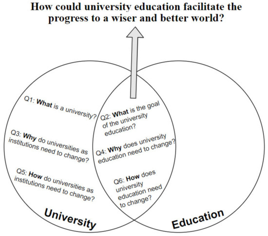 This paper focuses on HE as a research phenomenon (Figure 1). I seek to answer the main question: how could university education facilitate the progress to a wiser and better world? Here, I present the sub-questions, discuss the CSR methodology, and describe the data collection methods. The six sub-questions (Figure 2) are related to two themes: (1) the university as an institution and as a context (i.e., place and space) of HE; and (2) education as content, practice, and process.