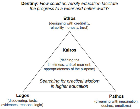 Aristotle argued that convincing argumentation and effective delivery of a message is based on ethos, pathos, and logos. Therefore, to present the case of “searching for wisdom in HE”, I will apply the elements of persuasive communication (Figure 3), namely kairos (i.e., purpose, appropriateness, timeliness, right, critical moment), logos (i.e., content, message, arguments, facts, evidence, logic, rationality), pathos (i.e., desire, imagination, feelings, emotions), and ethos (i.e., reliability, credibility, trust, positive feelings). The affirmative topic and its temporary character and critical timing were defined and discussed in the introduction (Figure 1). Here the focus is on logos, pathos, and ethos. Destiny will be presented in the conclusion.