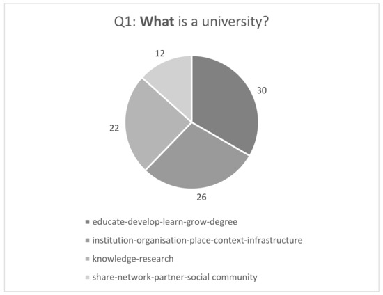 Next, based on primary data collected through my online research, I present the findings on how university practitioners and participants identified what a university is. These primary data could complement the secondary data in Table 1. In Figure 4, the findings of the online research show that the answers to what a university is formed four groups: (1) the roles of the university; (2) the university as a place, institution, and organization; (3) the university as a knowledge provider through research; and (4) the university as a partner, as part of the society. The following quotations are selected from the 24 responses received for Q1: