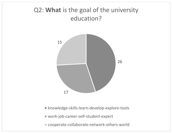 The findings for the question about the goals of university education (Q2) are presented in Figure 5. The goals of HE, according to the 17 answers from practitioners of and participants in HE, form three clusters (Figure 5): (1) providing knowledge, skills, and learning; (2) preparing students for the world of work; (3) cooperating and collaborating with others. These answers concur with the tasks of HE indicated by Barnett [39,41] and Auxier [40]. Furthermore, there are similarities between these answers and the Finnish Ministry of Education and Culture’s declaration: “the basic task of the universities is to engage in scientific research and provide the highest level of education based on it. Universities promote lifelong learning, interact with society and promote the societal impact of research results and artistic activities” [50]. Below are several selected responses to Q2: