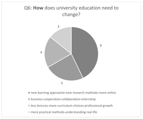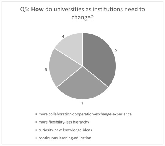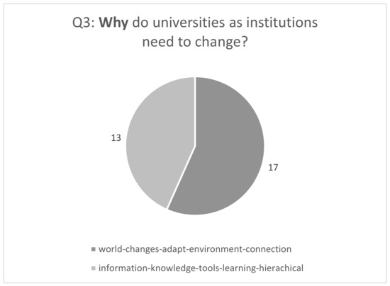 The findings of my primary research regarding the question about why universities as institutions need to change (Q3) are presented in Figure 6. There were 11 answers to Q3. The arguments clearly indicated external and internal factors of change, for example: