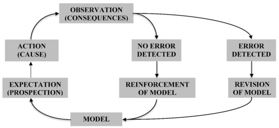 A more detailed understanding of how this learning/model-building process works can thus be a valuable resource for the development of an effective wisdom pedagogy. Such model-building occurs through the detection and correction of errors in prediction that result from models that are not completely adequate to reality. All our actions—and our perceptions as well, according to some cognitive scientists [44]—are based on what our (implicit or explicit) models of the world lead us to expect or predict their outcome will be. When our actions (or perceptions) are followed by the expected result, our model of the world is confirmed and reinforced. But when an action (or perception) fails to produce the expected result, our model is revised to accommodate the actual result of the action (or perception). The process begins with the (cause-effect) model, which leads us to expect that a certain action (cause) will produce a certain result (effect). We then execute the action and observe its results. If there is a discrepancy between our expectation and the observed consequences, our model is revised to account for the unexpected consequences, and the cycle is repeated, with the revised model leading to a revised expectation and/or a revised action, and so on. This iterative learning process can be modeled as shown in Figure 2 (based on [39], p. 62).