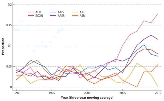 The proportion of research articles employing experimental design in top-ranked journals in economics, political science and sociology (three-year moving average). Abbreviations: AER, American Economic Review, ECON, Econometrica, AJPS, Amerinan Journal of Political Science, APSR, American Political Science Review, AJS, American Journal of Sociology, ASR, American Sociological Review.