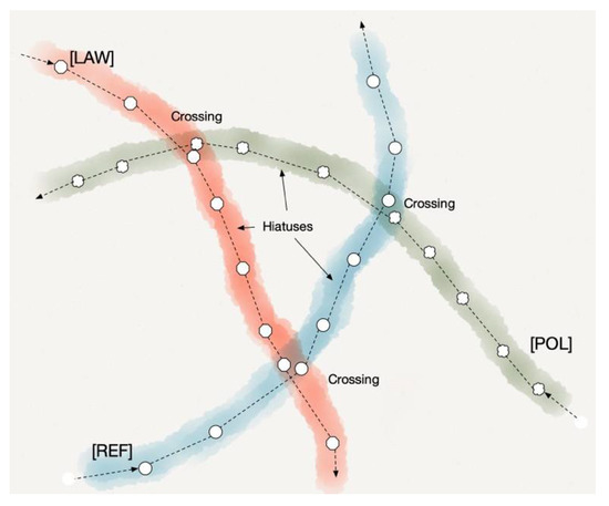 In 2012, a largely invisible project in the works for over 20 years made its public appearance with the publication of Bruno Latour’s Enquête sur les modes d’existence: Une anthropologie des Modernes, the English translation being published a year later [11]. In addition to the book, an interactive website was created to aid in portraying and understanding the modes of existence.1 In this book, Latour identifies fifteen modes of existence. Each mode operates according to a rationality or tonality of its own. We, as well as non-human actors, make our world and our way through it by deploying these modes. Each mode of existence makes sense differently, each being characterized by the nature of the gaps (the discontinuities) that must be bridged, the mode-specific trajectories of subsistence that are employed, the felicity/infelicity conditions involved, the beings that are engendered, and the alterations that are aimed for [11] (pp. 488–489). So, for example, science advances its claims in a many-fold manner quite distinct from law’s form of rationality; the mode of political existence is unlike that of religion or morality. As with the case of soil science at work in Boa Vista, each mode operates in a stepwise fashion; all modes extend their operations and the fashioning of beings across a series of discontinuities: “if no alteration, then no being” [12] (p. 39). All compose the continuity of their trajectories of subsistence across gaps that Latour calls hiatuses (as we illustrate in our discussion of Figure 1 below). None of the modes advances its continued existence on its own; rather, “We try out the Other” [12] (p. 319). The extension of a mode is a plural affair—and substantially multimodal. For in Latour’s notion of being-as-other (his alternative to being-as-being), “it is always via the other that being is extracted” [12] (p. 327). Thus, modes routinely cross through one another and, as a consequence, quite different modal rationalities come into play, producing differences of compositional practice that must be resolved. As Latour states, “Each mode will define itself through its own way of differing and obtaining being by way of the other” [12] (p. 316). As we will see, it is for this reason of ongoing negotiation and reconfiguration of modes that translational crossings are often perplexing and equivocal.