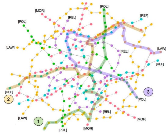 Before turning to our discussion of the crossings and entanglements of modes represented in Figure 1, Figure 2 and Figure 3,2 it is essential to describe, if only briefly, the fifteen modes of existence that Latour has gathered into five groups of three related modes. The first group—reproduction [REP], metamorphosis [MET], and habit [HAB]—concerns forms of being as alterity that multiply forms of persistence, multiply transformations, or rush forth into existence with dispatch, respectively [11] (p. 285). A second group—technology [TEC], fiction [FIC], and reference [REF] (the mode of science we saw in the Boa Vista study)—concerns quasi-objects,3 while the third group [11] (p. 372)—politics [POL], [LAW], and religion [REL]—addresses quasi-subjects.4 With these two modal groups, we see the conventional binary pair of subject and object replaced by entangled actors. Latour says succinctly: “What is an object? The set of quasi subjects that are attached to it. What is a subject? The set of quasi objects that are attached to it” [11] (p. 428). We are “sort of” subjects, interestingly and integrally adorned with a variety of objects. Objects are accompanied by a retinue of subjects. We are compositions; entities exist as filigreed, multimodal collectives.
