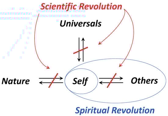 What we call world religions today are considered to have their roots in the “Spiritual Revolution”, which took place between 6th century BCE and 1st century CE [1,2,3,4]. The Spiritual Revolution occurred in human minds for the first time in history due to an era of crisis of corruption. In this regard, it differed from the other revolutions in which humans influenced nature and created physical objects. The Spiritual Revolution took place in four locations in parallel, Greece, India, China, and Israel, in search for universal principles as to how humans should live their lives. In Greece, it began with the discovery of “Psyche”, which led to the awareness of “Idea” as the objective of “Psyche”, and finally to “the idea of the good" (textitagathon in Greek philosophy). In China, “Tian" (the celestial aspect of the cosmos) was united with the Earth during the Zhou period, and it became “Tao” (practical order that is given by awareness of the Tian), which then turned into “Li” (ritual rules of propriety), and reached “Ren” (Confucian virtue of humanity denoting the good feeling a virtuous human experiences when being altruistic), which underlies “Li” in Confucianism. In India, it began as a matter of “suffering” (duḥkha in Sanskrit). Realizing the target (objective) of obsession, which causes suffering, is the ever-changing nonexisting “interdependence of all things” (pratītyasamutpāda in Sanskrit), or “the voidness that constitutes ultimate reality" (śūnyatā in Sanskrit); it eventually reached “unconditional kindness and compassion" (maitrīkaruṇā in Sanskrit). In ancient Israel, Torah was considered important, however, eventually formalized, Jesus Christ turned it into “Agape" (the highest form of love, and charity). The final ideas of the Spiritual Revolution in essence—“the idea of the good” in Greek philosophy, “unconditional mercy and compassion” in Buddhism, “Ren” in Confucianism, and “Agape” in Christianity—are the principles of our actions and behaviors toward others. The Spiritual Revolution brought about a structure that the self and others can coexist through those universals as mediators (Figure 1) [4].