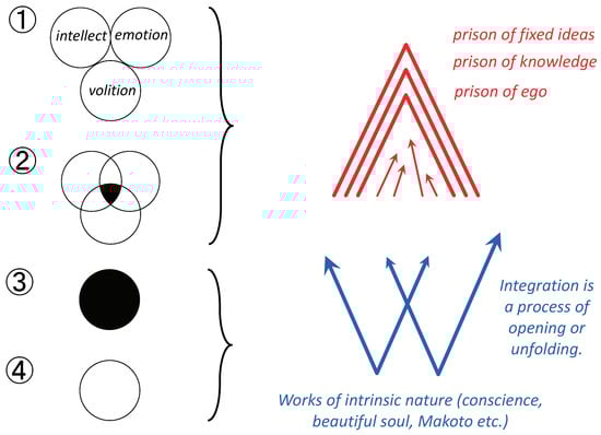 A schematic diagram of the process of integration. The symbol ① shows the state when intellect, emotion, and volition are separated. The symbols ② and ③ show the states of intellect, emotion, and volition when synthesized. The symbol ④ shows the state of intellect, emotion, and volition when integrated. The concept of intellect, emotion, and volition can be replaced with other concepts such as goodness, truth, and beauty.