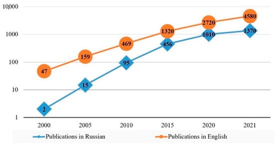 Dynamics of changes in the number of Russian and English publications focused on the concept of transhumanism in the Google Scholar system. Source: own development based on the analysis of Google Scholar data.