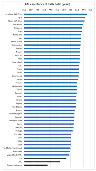Over the years, the idea of transhumanism has been centered on the issue of overcoming the limitations of the human body, changing its mental, physical, and cognitive capabilities []. At the same time, one of the expected consequences is the achievement of biological or other (cybernetic) forms of immortality, as well as the prolongation of human life. One of the available indicators for a comparative assessment of this goal’s achievement is the indicator of the human life expectancy level. An analysis of countries, associations of countries, and individual regions of the world with the highest life expectancy indicators shows that they are characterized by different standards of living and well-being, depending on the achieved economic and scientific progress development (Figure 2).