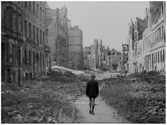 Ruderal plants are often mentioned for their capacity to “recolonise” debris after violent conflicts 24. In Germany, the flora and vegetation of Trümmerlandschaften, the rubble landscapes of the early post-war years, did not fail to catch the eye of botanists and ecologists, in particular in Berlin, a city divided by the Cold War and dotted with many interstitial, feral spaces 25. In Germania, Anno Zero (“Germany Year Zero”, 1948), Roberto Rossellini’s conclusion to his war trilogy, shot in Berlin in the summer of 1947, ruderals can be spotted pretty much everywhere. One sequence in particular comes to mind: after telling his teacher that he has just poisoned his ailing father, young Edmund Kohler wanders the city. He comes across a group of children playing football in a heavily blasted but blossoming street. He tries to join them, but the children rebuff him: Edmund walks away, making his way among a jungle of what looks like sticky goosefoot (Chenopodium botrys) 26 (Figure 2).
