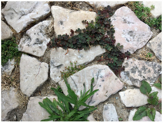 - Caneva, G.; Cutini, M.; Pacini, A.; Vinci, M. Analysis of the Colosseum’s floristic changes during the last four centuries. Plant Biosyst. 2002, 136, 291–311. [Google Scholar] [CrossRef]