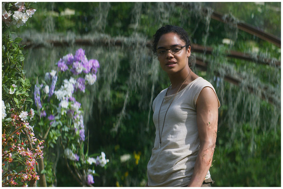 However, the stories of “contaminated diversity” that I have in mind are about companionship and collaborative survival, not death. As Tsing herself writes, “I use the term ‘contaminated diversity’ to refer to cultural and biological ways of life that have developed in relation to the last few hundred years of widespread human disturbance. Contaminated diversity is collaborative adaptation to human-disturbed ecosystems” (p. 95, [23]). Certainly, such stories can be deeply disturbing for humans, challenging their perceived individualism and exceptionalism, like in Alex Garland’s Annihilation (2018). In this xenobiological tale set in yet another Zone (a toxic ecosystem known as Area X), plant buds sprout in one of the characters’ arms (a timid astrophysicist played by Tessa Thompson) (Figure 6).