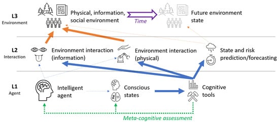 Thus, considering only computing power and performance as indicators of power of intellect is futile if predictive ability is ignored. An obligatory condition for the existence of real (living) intelligent systems is the consideration of time, its flow and the correlation of past, present and future events with the system itself and the surrounding world; a simplified diagram is presented in Figure 1. In the figure, an intelligent agent has access to sufficiently powerful intellectual tools that significantly enhance their ability to assess the environment (physical, social, informational), as well as their future states and associated risks. The agent also has access to tools for meta-cognitive analysis and assessment of the agent, their knowledge and abilities. However, access to these tools is limited by the cognitive interaction capabilities of an intelligent agent. We explicitly identify three levels (L1–L3) of intelligent system interaction with the environment: agent level, interaction level, and environment level. We consider two types of cross-level relationships: implicit (thin dashed lines) showing high-level conceptual interaction and explicit (thick lines) showing more detailed interaction through cognitive tools application.