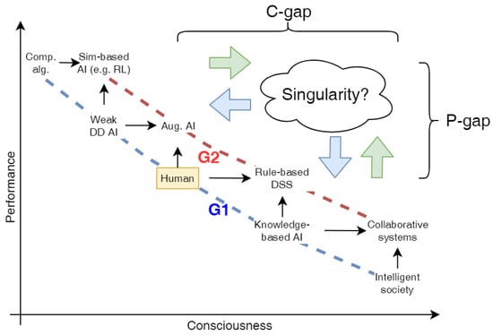 It should be noted that the solutions of the second generation seem to be more promising and relevant today in terms of AI development and building information systems. Nevertheless, even within the framework of a multidimensional scale, it remains possible to improve both the performance of the tools available to agents (P-gap) and the appropriateness of their use (C-gap). In the future, controllable complex systems, having emergence, can create precedents for self-organizing distributed intelligent systems [90] with desired or unexpected properties.