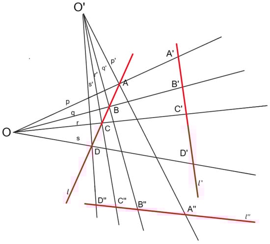 Here, a “pencil” of four rays, namely p, q, r, and s, radiating from point O, is sectioned by the line l to form a “range” of four points, namely A, B, C, and D, on that line. This pencil is said to “project” this range, from point O, onto a range of corresponding points, i.e., A′, B′, C′, and D′, on a further sectioning line l′, in such a way that the “cross-ratio” holding between the two ratios AB:BC and AD:DC will have the same value as that holding among the equivalent double ratio among points A′, B′, C′, and D′ on line l′. That is, the ratio between ratios AB:BC and AD:DC is equal to that between A′B′:B′C′ and A′D′:D′C′, or, expressed in fractions, = . Furthermore, if a different pencil of rays, i.e., p′, q′, r′, and s′, radiating from a different point O′ projects the original range onto a further sectioning line, l″, dividing it at A″, B″, C″, and D″, then that cross-ratio has the same value as well.