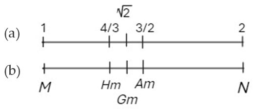 (a) The musical tetraktys; (b) the division of interval MN by the harmonic, geometric, and arithmetic means.