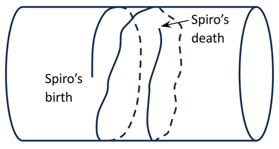 Figure 2 depicts a world in which Circle Hypothesis is true. In this world, time is a circle whose circumference is 30 years long. This world is inhabited by exactly one person, Spiro, who pops into existence as an infant and is cared for by a young man, Spiro, and by an older man, Spiro. At a certain point in Spiro’s childhood, the older man dies, aged 70 years. Spiro’s life winds around the cylinder of time2 more than once, and there are certain instants through which Spiro lives three times: as a child, as a young man, and as an older man. More cautiously put, Spiro’s life is 70 years long with respect to his personal time, in the sense of Lewis [8,9], despite the fact that external time in this world is a loop that is 30 years long3. See Sorabji [12] (pp. 320–322) for a detailed discussion of a case like this.
