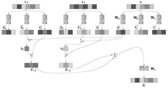 Figure 2, called “score”, result from the multiplication of the “query” and “key” vectors, and modulate the amount of the “value” vectors.