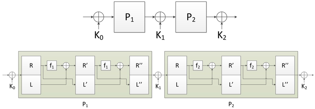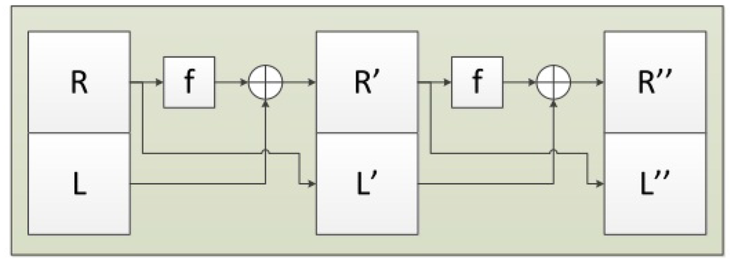 Figure 1 shows an illustration of 2-round Luby–Rackoff (balanced) permutation.