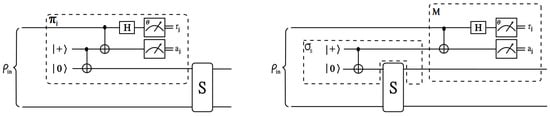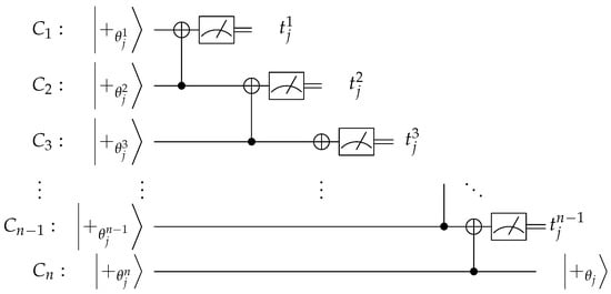 Therefore, Equation (9) holds for . Now, we will assume that the claim holds for , and we will prove it for n. After measurement of the qubit , the state of qubit is , where: